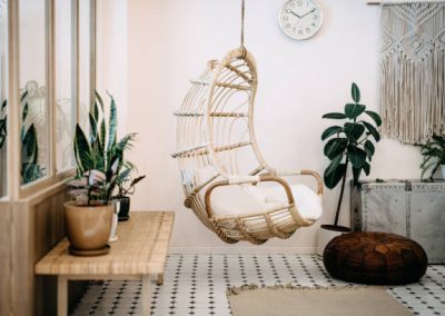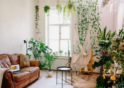 Cozy hanging chair in the loft living room with stylish and bohemia design. Well designed and decorated with an assortment of interesting plants